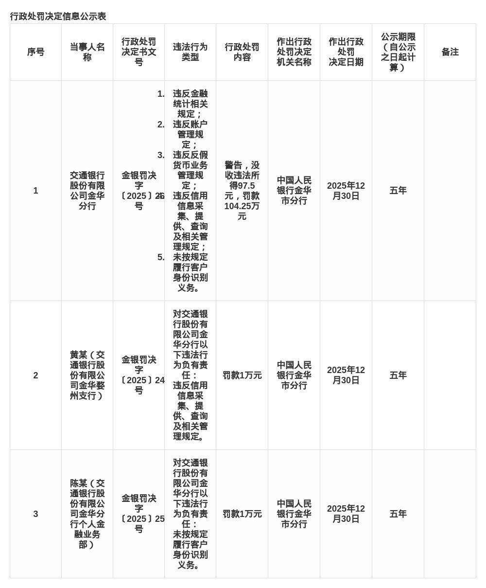 罚单显示,交通银行股份有限公司金华分行的主要违法违规事实包括:违反金融统计相关规定,违反账户管理规定,违反反假货币业务管理规定,违反信用信息采集、提供、查询及相关管理规定,未按规定履行客户身份识别义务。